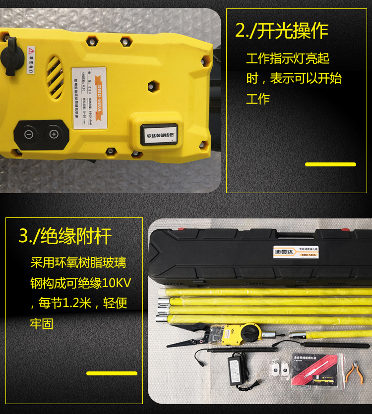 附掛桿:可絕緣10KV,材質(zhì)由絕緣玻璃鋼環(huán)氧管構(gòu)成,四根90cm長桿,一根43cm電池桿。